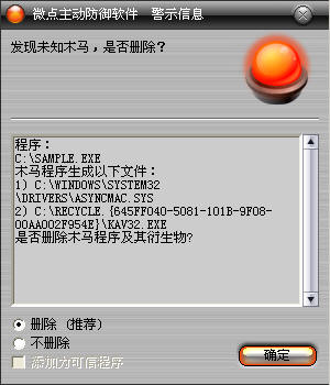 已安装使用微点主动防御软件的用户,无须任何设置,微点主动防御将自动保护您的系统免受该病毒的入侵和破坏。无论您是否已经升级到最新版本,微点主动防御都能够有效清除该病毒。如果您没有将微点主动防御软件升级到最新版,微点主动防御软件在发现该病毒后将报警提示您发现“未知木马”,请直接选择删除处理(如图1);
