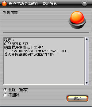 已安装使用微点主动防御软件的用户,无须任何设置,微点主动防御将自动保护您的系统免受该病毒的入侵和破坏。无论您是否已经升级到最新版本,微点主动防御都能够有效清除该病毒。如果您没有将微点主动防御软件升级到最新版,微点主动防御软件在发现该病毒后将报警提示您发现“病毒”,请直接选择删除处理(如图1);