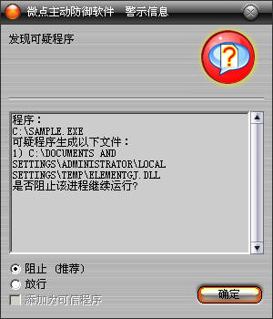 已安装使用微点主动防御软件的用户,无须任何设置,微点主动防御将自动保护您的系统免受该病毒的入侵和破坏。无论您是否已经升级到最新版本,微点主动防御都能够有效清除该病毒。如果您没有将微点主动防御软件升级到最新版,微点主动防御软件在发现该病毒后将报警提示您发现“可疑程序”,请直接选择删除处理(如图1);