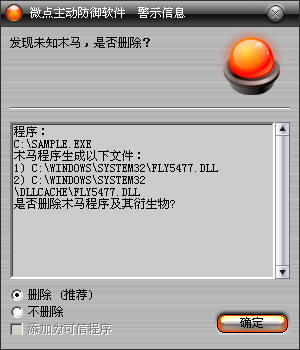 已安装使用微点主动防御软件的用户,无须任何设置,微点主动防御将自动保护您的系统免受该病毒的入侵和破坏。无论您是否已经升级到最新版本,微点主动防御都能够有效清除该病毒。如果您没有将微点主动防御软件升级到最新版,微点主动防御软件在发现该病毒后将报警提示您发现“未知木马”,请直接选择删除处理(如图1);