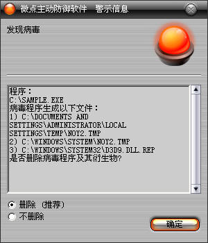 已安装使用微点主动防御软件的用户,无须任何设置,微点主动防御将自动保护您的系统免受该病毒的入侵和破坏。无论您是否已经升级到最新版本,微点主动防御都能够有效清除该病毒。如果您没有将微点主动防御软件升级到最新版,微点主动防御软件在发现该病毒后将报警提示您发现“病毒”,请直接选择删除处理(如图1);