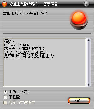已安装使用微点主动防御软件的用户,无须任何设置,微点主动防御将自动保护您的系统免受该病毒的入侵和破坏。无论您是否已经升级到最新版本,微点主动防御都能够有效清除该病毒。如果您没有将微点主动防御软件升级到最新版,微点主动防御软件在发现该病毒后将报警提示您发现“未知木马”,请直接选择删除处理(如图1);