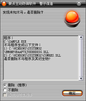 已安装使用微点主动防御软件的用户,无须任何设置,微点主动防御将自动保护您的系统免受该病毒的入侵和破坏。无论您是否已经升级到最新版本,微点主动防御都能够有效清除该病毒。如果您没有将微点主动防御软件升级到最新版,微点主动防御软件在发现该病毒后将报警提示您发现“未知木马”,请直接选择删除处理(如图1);
