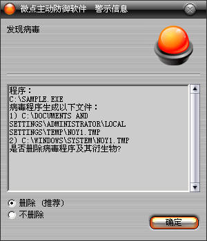 已安装使用微点主动防御软件的用户,无须任何设置,微点主动防御将自动保护您的系统免受该病毒的入侵和破坏。无论您是否已经升级到最新版本,微点主动防御都能够有效清除该病毒。如果您没有将微点主动防御软件升级到最新版,微点主动防御软件在发现该病毒后将报警提示您发现“病毒”,请直接选择删除处理(如图1);
