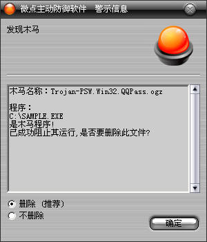 如果您已经将微点主动防御软件升级到最新版本,微点将报警提示您发现"Trojan-PSW.Win32.QQPass.ogz”,请直接选择删除(如图2)。