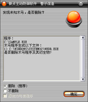 已安装使用微点主动防御软件的用户,无须任何设置,微点主动防御将自动保护您的系统免受该病毒的入侵和破坏。无论您是否已经升级到最新版本,微点主动防御都能够有效清除该病毒。如果您没有将微点主动防御软件升级到最新版,微点主动防御软件在发现该病毒后将报警提示您发现“未知木马”,请直接选择删除处理(如图1);