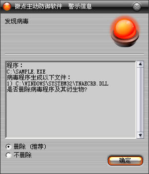 已安装使用微点主动防御软件的用户,无须任何设置,微点主动防御将自动保护您的系统免受该病毒的入侵和破坏。无论您是否已经升级到最新版本,微点主动防御都能够有效清除该病毒。如果您没有将微点主动防御软件升级到最新版,微点主动防御软件在发现该病毒后将报警提示您发现“病毒”,请直接选择删除处理(如图1);