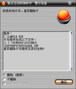 已安装使用微点主动防御软件的用户,无须任何设置,微点主动防御将自动保护您的系统免受该病毒的入侵和破坏。无论您是否已经升级到最新版本,微点主动防御都能够有效清除该病毒。如果您没有将微点主动防御软件升级到最新版,微点主动防御软件在发现该病毒后将报警提示您发现“未知木马”,请直接选择删除处理(如图1);