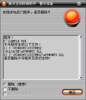 已安装使用微点主动防御软件的用户,无须任何设置,微点主动防御将自动保护您的系统免受该病毒的入侵和破坏。无论您是否已经升级到最新版本,微点主动防御都能够有效清除该病毒。如果您没有将微点主动防御软件升级到最新版,微点主动防御软件在发现该病毒后将报警提示您发现“未知后门程序”,请直接选择删除处理(如图1);