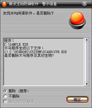 已安装使用微点主动防御软件的用户,无须任何设置,微点主动防御将自动保护您的系统免受该病毒的入侵和破坏。无论您是否已经升级到最新版本,微点主动防御都能够有效清除该病毒。如果您没有将微点主动防御软件升级到最新版,微点主动防御软件在发现该病毒后将报警提示您发现“未知间谍软件”,请直接选择删除处理(如图1);