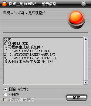 已安装使用微点主动防御软件的用户,无须任何设置,微点主动防御将自动保护您的系统免受该病毒的入侵和破坏。无论您是否已经升级到最新版本,微点主动防御都能够有效清除该病毒。如果您没有将微点主动防御软件升级到最新版,微点主动防御软件在发现该病毒后将报警提示您发现“未知木马”,请直接选择删除处理(如图1);