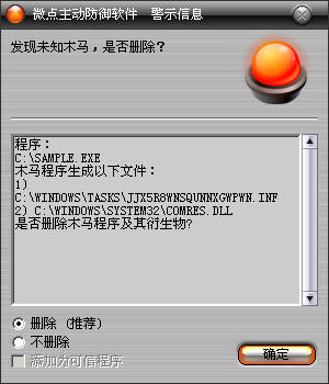 已安装使用微点主动防御软件的用户,无须任何设置,微点主动防御将自动保护您的系统免受该病毒的入侵和破坏。无论您是否已经升级到最新版本,微点主动防御都能够有效清除该病毒。如果您没有将微点主动防御软件升级到最新版,微点主动防御软件在发现该病毒后将报警提示您发现“未知木马”,请直接选择删除处理(如图1);