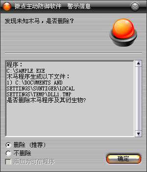 已安装使用微点主动防御软件的用户,无须任何设置,微点主动防御将自动保护您的系统免受该病毒的入侵和破坏。无论您是否已经升级到最新版本,微点主动防御都能够有效清除该病毒。如果您没有将微点主动防御软件升级到最新版,微点主动防御软件在发现该病毒后将报警提示您发现“未知木马”,请直接选择删除处理(如图1);