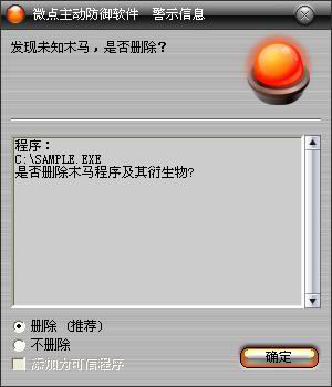 已安装使用微点主动防御软件的用户,无须任何设置,微点主动防御将自动保护您的系统免受该病毒的入侵和破坏。无论您是否已经升级到最新版本,微点主动防御都能够有效清除该病毒。如果您没有将微点主动防御软件升级到最新版,微点主动防御软件在发现该病毒后将报警提示您发现“未知木马”,请直接选择删除处理(如图1);