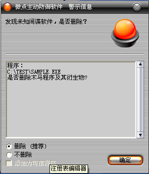 已安装使用微点主动防御软件的用户,无须任何设置,微点主动防御将自动保护您的系统免受该病毒的入侵和破坏。无论您是否已经升级到最新版本,微点主动防御都能够有效清除该病毒。如果您没有将微点主动防御软件升级到最新版,微点主动防御软件在发现该病毒后将报警提示您发现“未知间谍软件”,请直接选择删除处理(如图1);