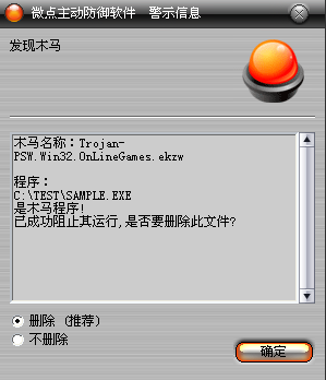 如果您已经将微点主动防御软件升级到最新版本,微点将报警提示您发现"Trojan-PSW.Win32.OnLineGames.ekzw”,请直接选择删除(如图2)。
