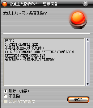 已安装使用微点主动防御软件的用户,无须任何设置,微点主动防御将自动保护您的系统免受该病毒的入侵和破坏。无论您是否已经升级到最新版本,微点主动防御都能够有效清除该病毒。如果您没有将微点主动防御软件升级到最新版,微点主动防御软件在发现该病毒后将报警提示您发现“未知木马”,请直接选择删除处理(如图1);