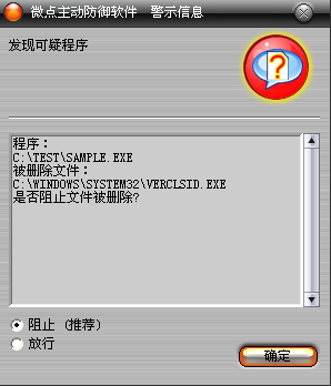 已安装使用微点主动防御软件的用户,无须任何设置,微点主动防御将自动保护您的系统免受该病毒的入侵和破坏。无论您是否已经升级到最新版本,微点主动防御都能够有效清除该病毒。如果您没有将微点主动防御软件升级到最新版,微点主动防御软件在发现该病毒后将报警提示您发现“可疑程序”,请直接选择删除处理(如图1);