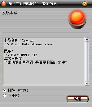 如果您已经将微点主动防御软件升级到最新版本,微点将报警提示您发现"Trojan-PSW.Win32.OnLineGames.elmm”,请直接选择删除(如图2)。