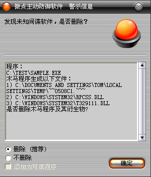 图1 微点主动防御软件自动捕获未知病毒(未升级)