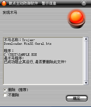 如果您已经将微点主动防御软件升级到最新版本,微点将报警提示您发现"Trojan-Downloader.Win32.Geral.btx”,请直接选择删除(如图2)。