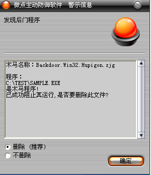 如果您已经将微点主动防御软件升级到最新版本,微点将报警提示您发现"Backdoor.Win32.Hupigon.zjg”,请直接选择删除(如图2)。