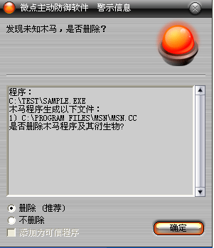 图1 微点主动防御软件自动捕获未知病毒(未升级)