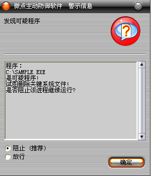 已安装使用微点主动防御软件的用户,无须任何设置,微点主动防御将自动保护您的系统免受该病毒的入侵和破坏。无论您是否已经升级到最新版本,微点主动防御都能够有效清除该病毒。如果您没有将微点主动防御软件升级到最新版,微点主动防御软件在发现该病毒后将报警提示您发现“可疑程序”,请直接选择删除处理(如图1);
