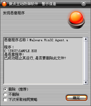 如果您已经将微点主动防御软件升级到最新版本,微点将报警提示您发现"Malware.Win32.Agent.a”,请直接选择删除(如图2)。