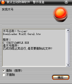 如果您已经将微点主动防御软件升级到最新版本,微点将报警提示您发现"Trojan-Downloader.Win32.Geral.btw”,请直接选择删除(如图2)。