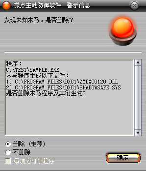 图1 微点主动防御软件自动捕获未知病毒(未升级)