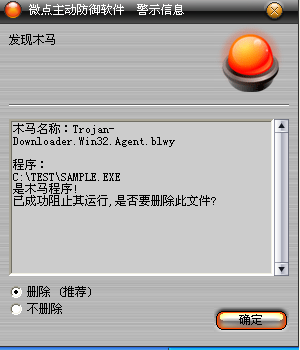 如果您已经将微点主动防御软件升级到最新版本,微点将报警提示您发现"Trojan-Downloader.Win32.Agent.blwy”,请直接选择删除(如图2)。