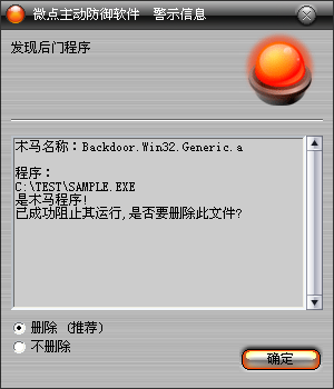 如果您已经将微点主动防御软件升级到最新版本,微点将报警提示您发现"Backdoor.Win32.Generic.a”,请直接选择删除(如图2)。