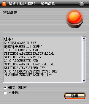 已安装使用微点主动防御软件的用户,无须任何设置,微点主动防御将自动保护您的系统免受该病毒的入侵和破坏。无论您是否已经升级到最新版本,微点主动防御都能够有效清除该病毒。如果您没有将微点主动防御软件升级到最新版,微点主动防御软件在发现该病毒后将报警提示您发现“病毒“,请直接选择删除处理(如图1);