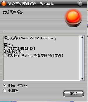 如果您已经将微点主动防御软件升级到最新版本,微点将报警提示您发现木马"Worm.Win32.AutoRun.j”,请直接选择删除(如图2)。