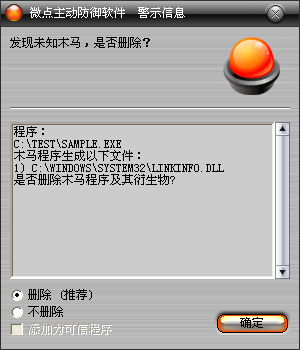 已安装使用微点主动防御软件的用户,无须任何设置,微点主动防御将自动保护您的系统免受该病毒的入侵和破坏。无论您是否已经升级到最新版本,微点主动防御都能够有效清除该病毒。如果您没有将微点主动防御软件升级到最新版,微点主动防御软件在发现该病毒后将报警提示您发现“未知木马“,请直接选择删除处理(如图1);