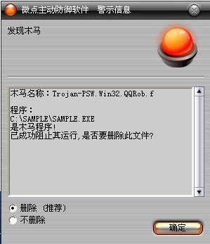 如果您已经将微点主动防御软件升级到最新版本,微点将报警提示您发现木马"Trojan-PSW.Win32.QQRob.f”,请直接选择删除(如图2)。