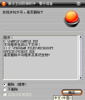已安装使用微点主动防御软件的用户,无须任何设置,微点主动防御将自动保护您的系统免受该病毒的入侵和破坏。无论您是否已经升级到最新版本,微点主动防御都能够有效清除该病毒。如果您没有将微点主动防御软件升级到最新版,微点主动防御软件在发现该病毒后将报警提示您发现“未知木马“,请直接选择删除处理(如图1);