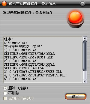 已安装使用微点主动防御软件的用户,无须任何设置,微点主动防御将自动保护您的系统免受该病毒的入侵和破坏。无论您是否已经升级到最新版本,微点主动防御都能够有效清除该病毒。如果您没有将微点主动防御软件升级到最新版,微点主动防御软件在发现该病毒后将报警提示您发现“未知间谍软件“,请直接选择删除处理(如图1);