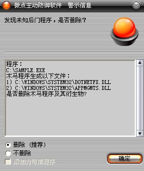 已安装使用微点主动防御软件的用户,无须任何设置,微点主动防御将自动保护您的系统免受该病毒的入侵和破坏。无论您是否已经升级到最新版本,微点主动防御都能够有效清除该病毒。如果您没有将微点主动防御软件升级到最新版,微点主动防御软件在发现该病毒后将报警提示您发现“未知后门程序“,请直接选择删除处理(如图1);