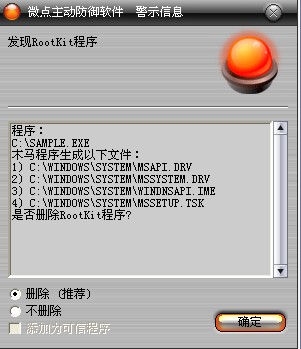 已安装使用微点主动防御软件的用户,无须任何设置,微点主动防御将自动保护您的系统免受该病毒的入侵和破坏。无论您是否已经升级到最新版本,微点主动防御都能够有效清除该病毒。如果您没有将微点主动防御软件升级到最新版,微点主动防御软件在发现该病毒后将报警提示您发现“RootKit程序“,请直接选择删除处理(如图1);