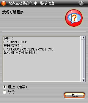 已安装使用微点主动防御软件的用户,无须任何设置,微点主动防御将自动保护您的系统免受该病毒的入侵和破坏。无论您是否已经升级到最新版本,微点主动防御都能够有效清除该病毒。如果您没有将微点主动防御软件升级到最新版,微点主动防御软件在发现该病毒后将报警提示您发现“可疑程序“,请直接选择删除处理(如图1);