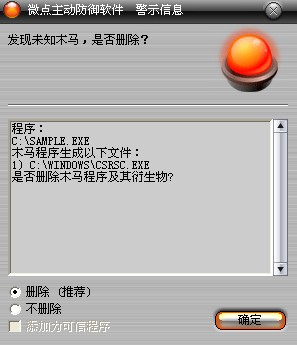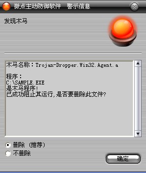 如果您已经将微点主动防御软件升级到最新版本,微点将报警提示您发现木马"Trojan-Dropper.Win32.Agent.a”,请直接选择删除(如图2)。