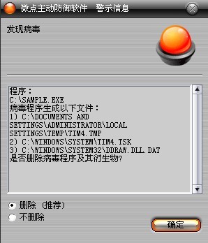 已安装使用微点主动防御软件的用户,无须任何设置,微点主动防御将自动保护您的系统免受该病毒的入侵和破坏。无论您是否已经升级到最新版本,微点主动防御都能够有效清除该病毒。如果您没有将微点主动防御软件升级到最新版,微点主动防御软件在发现该病毒后将报警提示您发现“病毒“,请直接选择删除处理(如图1);
