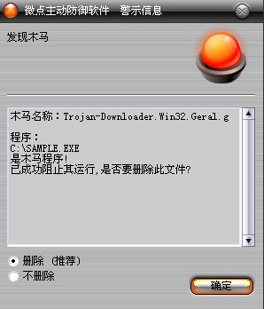 如果您已经将微点主动防御软件升级到最新版本,微点将报警提示您发现木马"Trojan-Downloader.Win32.Geral.g”,请直接选择删除(如图2)。