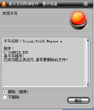 如果您已经将微点主动防御软件升级到最新版本,微点将报警提示您发现木马"Trojan.Win32.Mepaow.a”,请直接选择删除(如图2)。