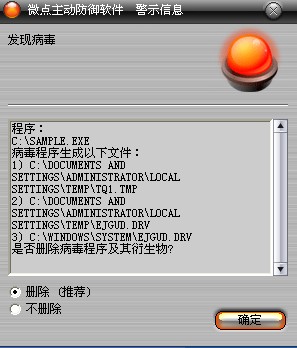 已安装使用微点主动防御软件的用户,无须任何设置,微点主动防御将自动保护您的系统免受该病毒的入侵和破坏。无论您是否已经升级到最新版本,微点主动防御都能够有效清除该病毒。如果您没有将微点主动防御软件升级到最新版,微点主动防御软件在发现该病毒后将报警提示您发现“病毒“,请直接选择删除处理(如图1);