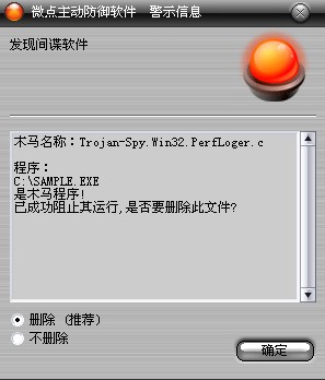 如果您已经将微点主动防御软件升级到最新版本,微点将报警提示您发现木马"Trojan-Spy.Win32.PerfLoger.c”,请直接选择删除(如图2)。