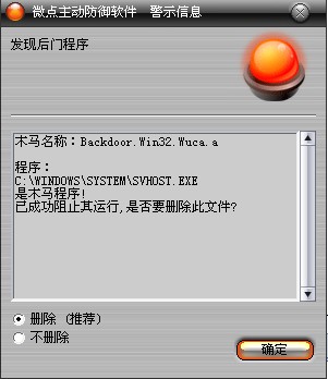 如果您已经将微点主动防御软件升级到最新版本,微点将报警提示您发现木马"Backdoor.Win32.Wuca.a”,请直接选择删除(如图2)。
