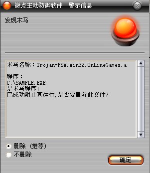 如果您已经将微点主动防御软件升级到最新版本,微点将报警提示您发现木马"Trojan-PSW.Win32.OnLineGames.a”,请直接选择删除(如图2)。